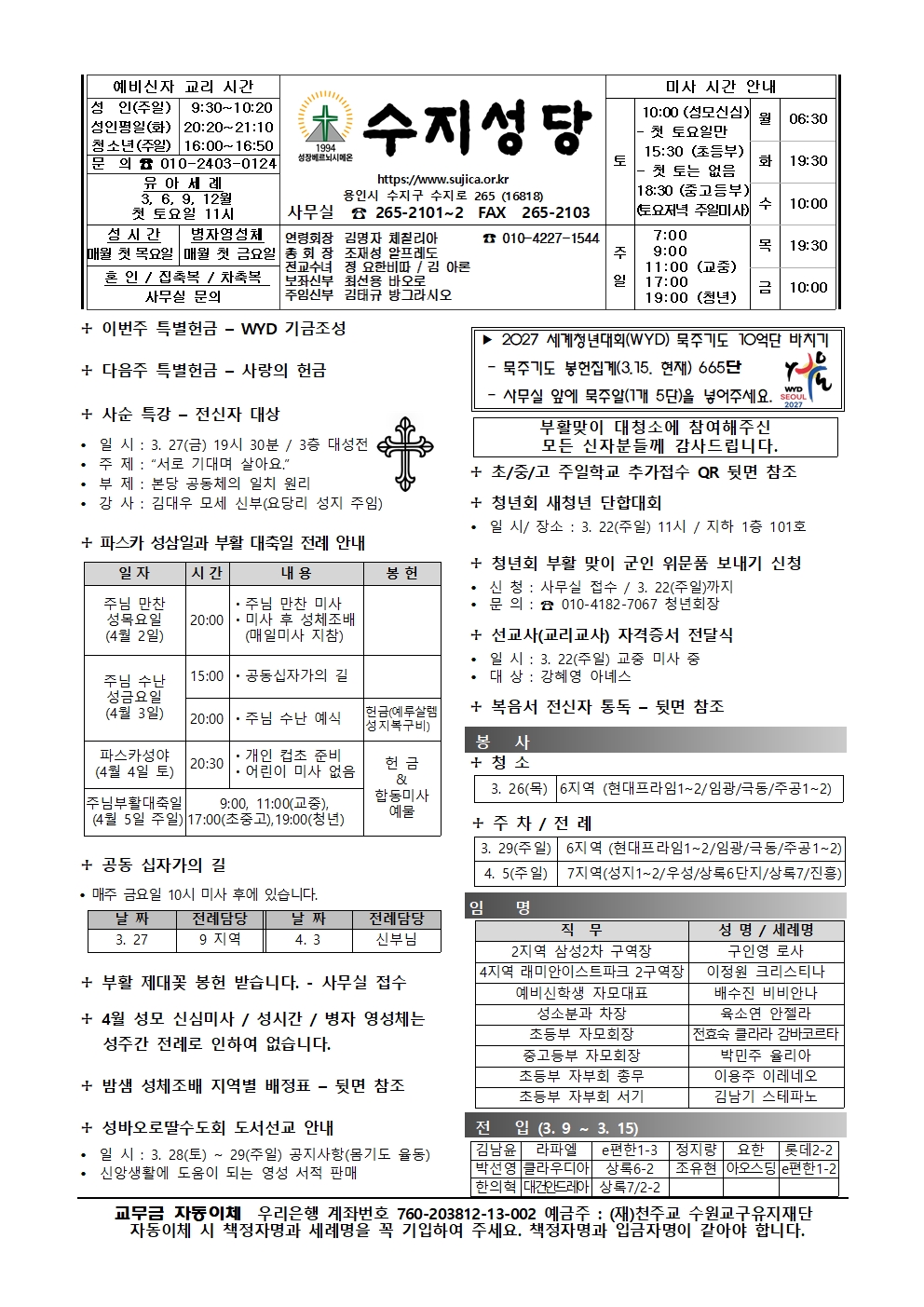 2026. 3. 22 - 사순 제5주일 페이지 정보 작성자 사무실 작성일 26-03-20 09:11 조회 19 댓글 0 본문 수원교구 주보는 아래 링크를 클릭하십시오. 관련링크 https://www.casuwon.or.kr/journal/jubo/ebook/2365 0회 연결 다음글 2026. 3. 15 - 사순 제4주일 댓글목록 0 등록된 댓글이 없습니다.