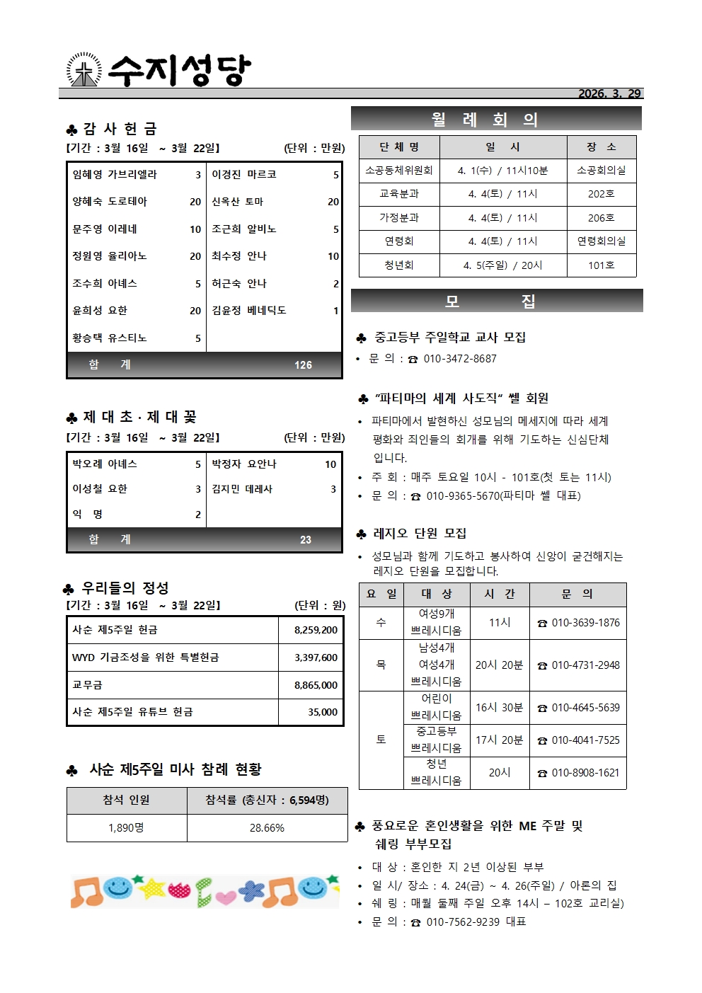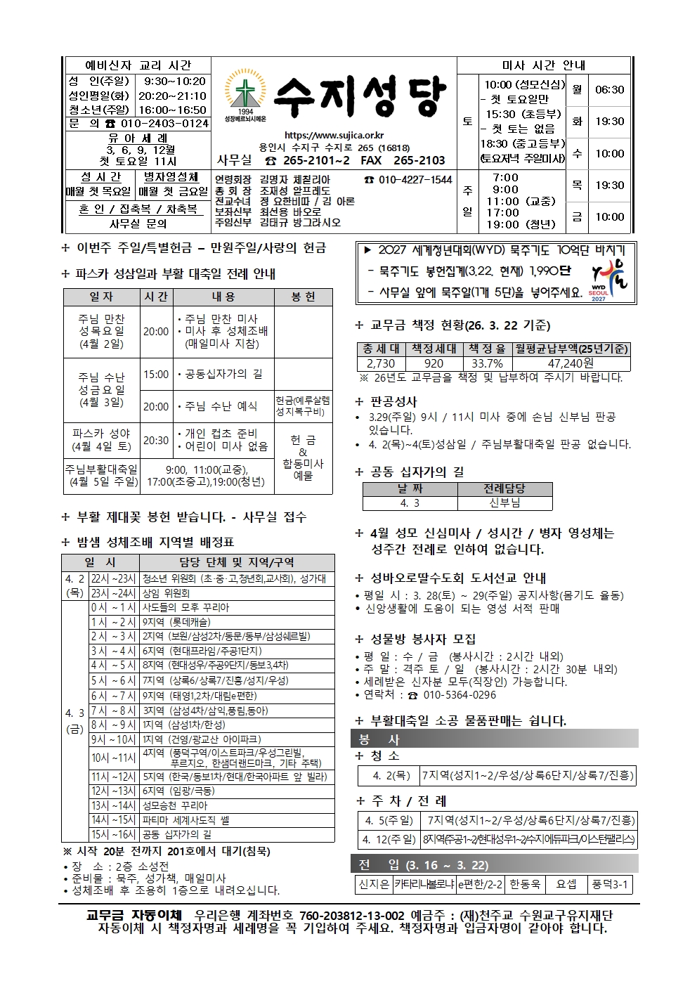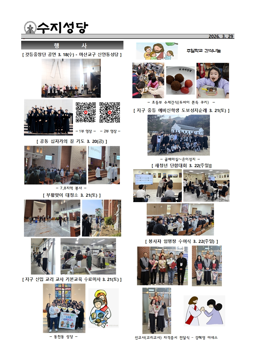 2026. 3. 29 - 주님 수난 성지 주일 페이지 정보 작성자 사무실 댓글 0건 조회 32회 작성일 26-03-27 09:12 목록 본문 수원교구 주보는 아래 링크를 클릭하십시오. 관련링크 https://www.casuwon.or.kr/journal/jubo/ebook/2366 0회 연결 다음글2026. 3. 22 - 사순 제5주일 26.03.20 댓글 0 댓글목록 등록된 댓글이 없습니다.
