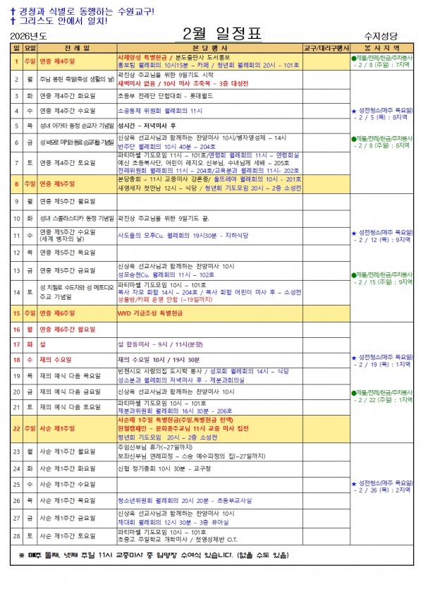 일정표 2월 일정표 페이지 정보 작성자 사무실 댓글 0건 조회 749회 작성일 26-02-01 07:39 목록 게시판 리스트 옵션 검색 본문 일정표 이전글2026년 3월 성가번호 26.03.03 다음글2026년 2월 성가번호 26.01.27 댓글 0 댓글목록 등록된 댓글이 없습니다.