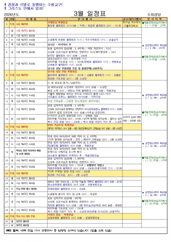 일정표 3월 일정표 페이지 정보 작성자 사무실 댓글 0건 조회 290회 작성일 26-03-04 15:15 목록 게시판 리스트 옵션 검색 본문 3월 일정표 다음글2026년 3월 성가번호 26.03.03 댓글 0 댓글목록 등록된 댓글이 없습니다.