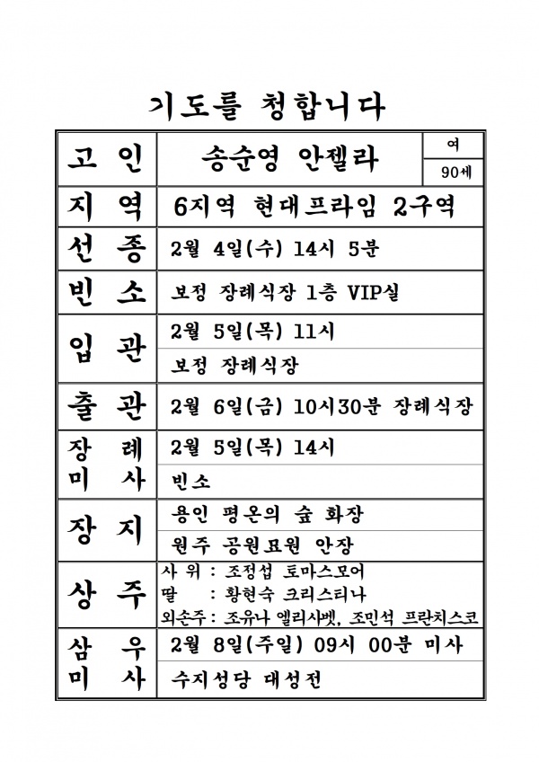연도 연도공지(송순영 안젤라) 페이지 정보 작성자 사무실 댓글 0건 조회 560회 작성일 26-02-04 16:31 목록 본문 삼가 고인의 명복을 빕니다. 이전글연도공지(김영미 율리아나) 26.03.01 다음글2월 일정표 26.02.01 댓글 0 댓글목록 등록된 댓글이 없습니다.